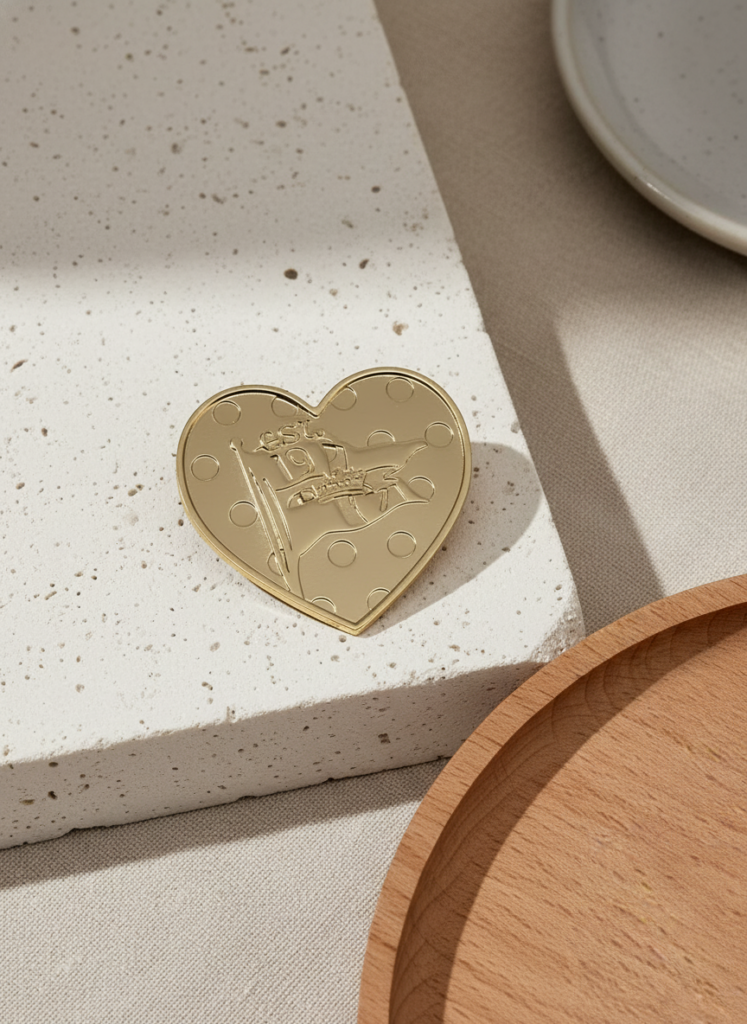 플랫한 하트 쉐입 위에 패턴과 로고를 음각으로 표현해그래픽적인 브랜드 무드를 강조했으며,골드 톤 마감을 통해 빈티지하면서도 캐주얼한 인상을 완성했습니다.