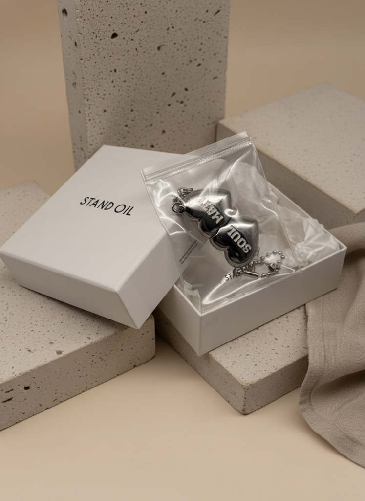 스탠드오일(STAND OIL)을 위해 제작된 하트 쉐입 메탈 키링입니다.볼륨감 있는 유기적 실루엣과 미러 폴리싱 니켈 마감으로브랜드 특유의 미니멀하면서도 감각적인 무드를 표현했습니다.