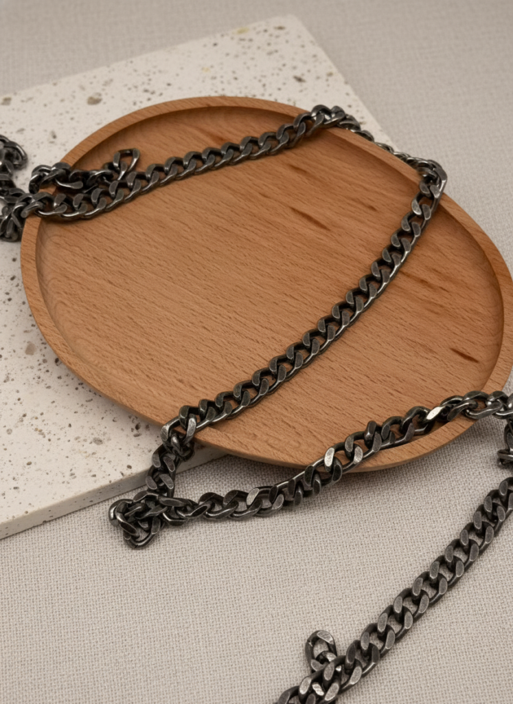 자체 제작한 클래식 링크 타입의 메탈 체인입니다.균일한 링크 두께와 안정적인 간격으로 구성해 가방 스트랩, 참 장식 등 다양한 부자재에 활용할 수 있도록 설계했습니다.