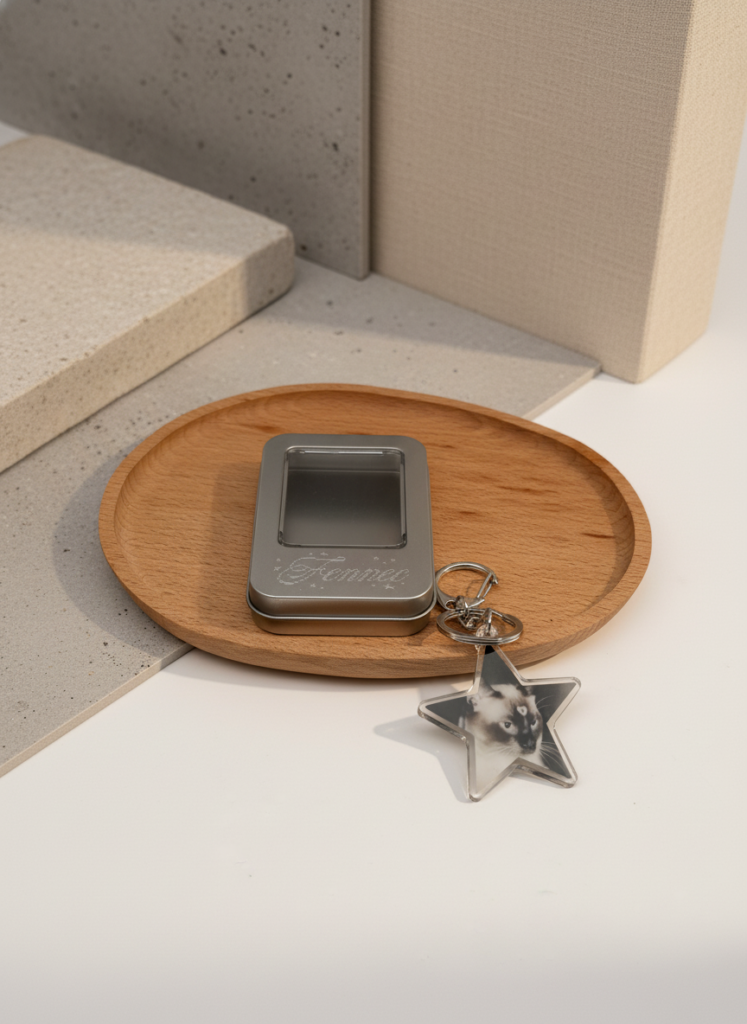 함께 구성된 아크릴 참은포토 프린트 기법을 사용해 개성을 더했으며,키링, 가방 참 등 다양한 방식으로 활용 가능하도록 설계되었습니다.